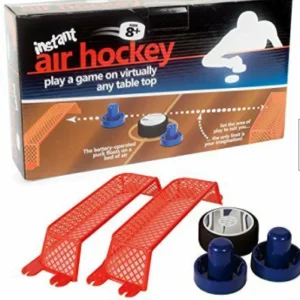 Play this classic amusement arcade game on any smooth table top. The great packaging contains 2 goals, 2 pushers and a puck that floats on a bed of air. Requires 2 x AAA batteries.